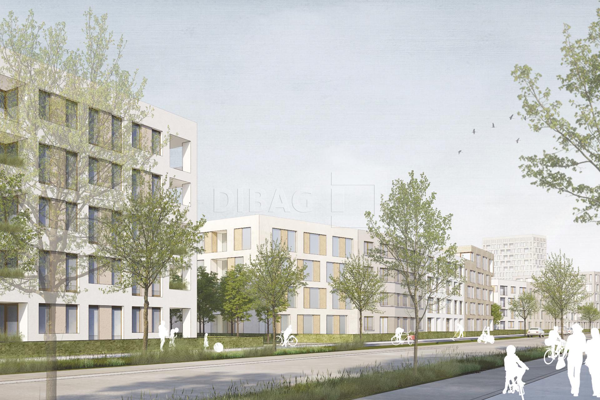 Das Herz der neuen Nachbarschaft ist die Promenade. An ihr partizipieren alle Gebäude und formen gleichzeitigen ihr räumliches Gefüge. Die Promenade ist völlig autofrei und beherbergt öffentliche, halböffentliche und private Funktionen. Die Promenade besitzt eine Vielzahl von Verbindungen zum städtischen Umfeld im Norden und der neuen Parklandschaft im Süden. An ihrem östlichen und westlichen Anfang & Ende bietet sie platzartige Anknüpfungsflächen für zukünftige Entwicklungen. Alle Gebäude sind horizontal wie vertikal gestaffelt. Sie bilden zusammen in einem wirtschaftlichen Gesamtraster ein volumetrisches Spiel von Licht und Schatten, Weite und Enge, Platz und Gasse.