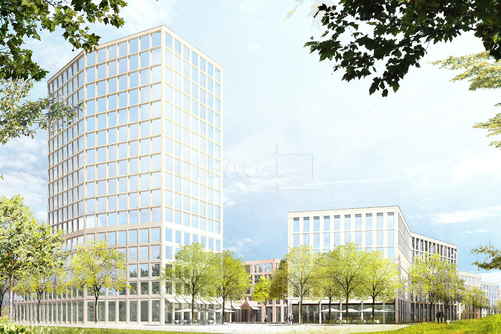 Das auf den ersten Blick wenig attraktive Grundstück wird mit fünf Baukörpern und einem fetten Wall zu einem wunderbaren, auf den Freiraum fokussierten, Stück Stadt, welches sich selbstbewusst nach außen präsentiert. Der Schlüssel des Projektes ist ein zentraler Platz um den sich die beiden Hochpunkte gruppieren, und in welchem die parkähnliche Landschaft Ihren Auftakt findet. Hochpunkt: Durch eine geschickte Drehung wird ein 120m hohes Haus bauordnungskonform in den Stadtraum gesetzt – das Tor zur Stadt formuliert. In der unteren Hälfte befinden sich Büroflächen, darüber feine Wohnadressen mit Alpenblick.